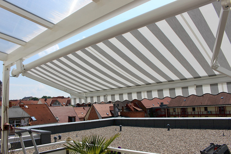 Erweitern Sie Ihren Wohnraum um ein Outdorr-Wohnzimmer mit textilem Sonnendach. Hier sind Sie bestens geschützt vor Sonne, Wind und Regen und können den Sommer genießen. Unsere schlanken Gelenkarmmarkisen fügen sich im eingefahrenen Zustand harmonisch in die Hausfassade ein und behalten dabei ihr ansprechendes Aussehen.